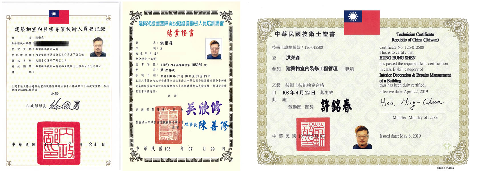 在經過營建署登記核可後,負責依照核可的設計工程圖說進行工程發包監造(俗稱統包),可以代客申請「建築物室內裝修合格證」,也就是政府所規定在完工驗收時「竣工查核」的簽證事宜。